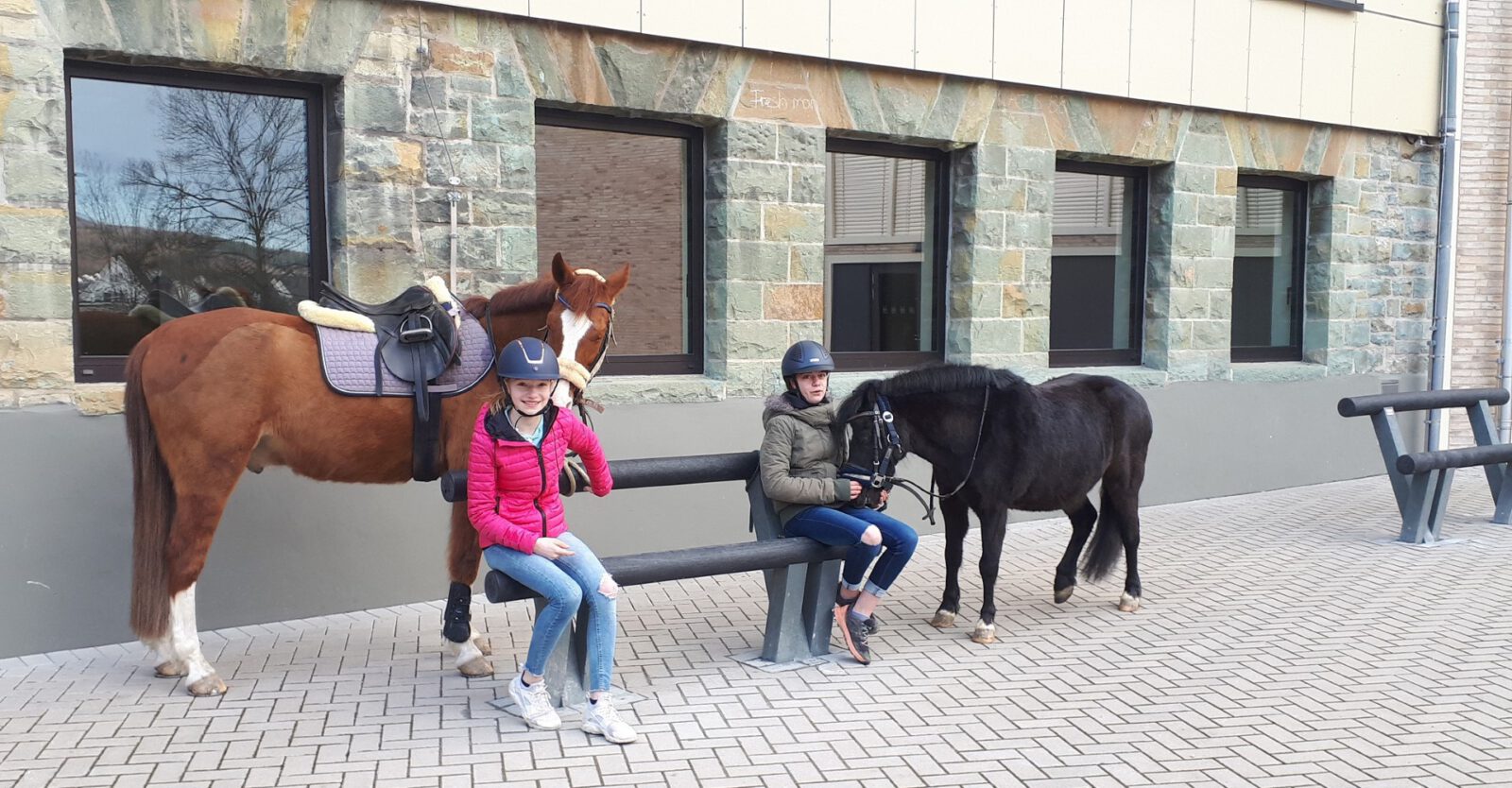 Mit der Anschaffung neuer Sitzbänke durch den Förderverein bietet sich seit dem heutigen Donnerstag für Schülerinnen und Schüler die Möglichkeit, auf dem eigenen Pferd zur Schule zu reiten. Dort können die Pferde sicher an den Bänken angebunden und nach Unterrichtsschluss wieder für den Rückweg nach Hause genutzt werden.