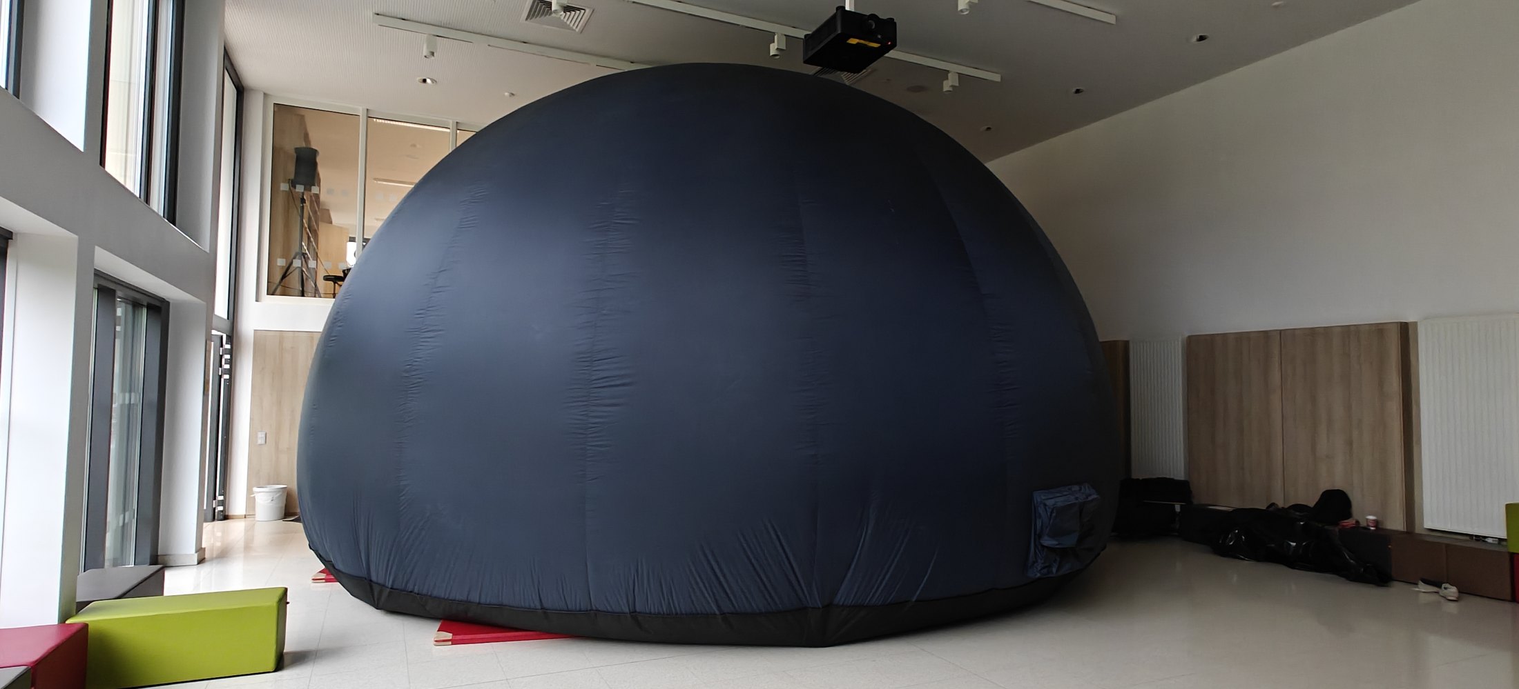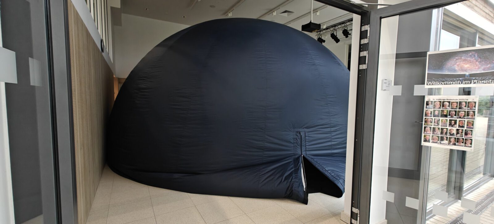 An den letzten beiden Tagen vor den Herbstferien wurde das Forum unserer Schule zu einem ganz besonderen Ort: Ein riesiges (über 7 Meter im Durchmesser), aufblasbares Planetarium-Zelt verwandelte die Aula in ein Fenster zum Universum. Mit Hilfe eines Projektors, der ein 360-Grad-Rundumbild an die innere Kuppel des Zelts warf, konnten die Schülerinnen und Schüler auf eine faszinierende Reise durch das Weltall gehen – ganz ohne das Schulgelände zu verlassen.