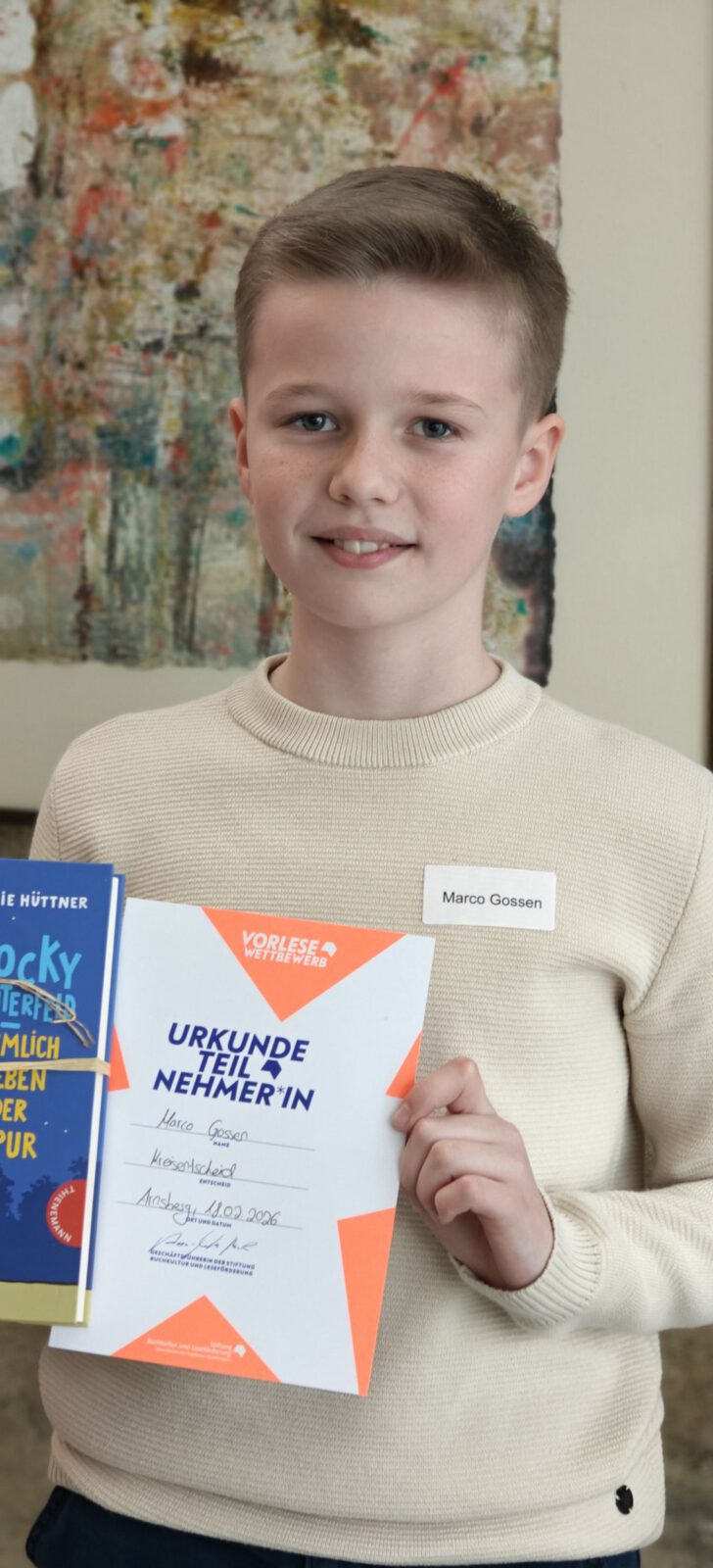 Marco Gossen aus der Klasse 6b vertrat am heutigen Mittwoch würdig unsere Schule als Schulsieger des Vorlesewettbewerbs beim Kreisentscheid im Sauerlandmuseum in Arnsberg.