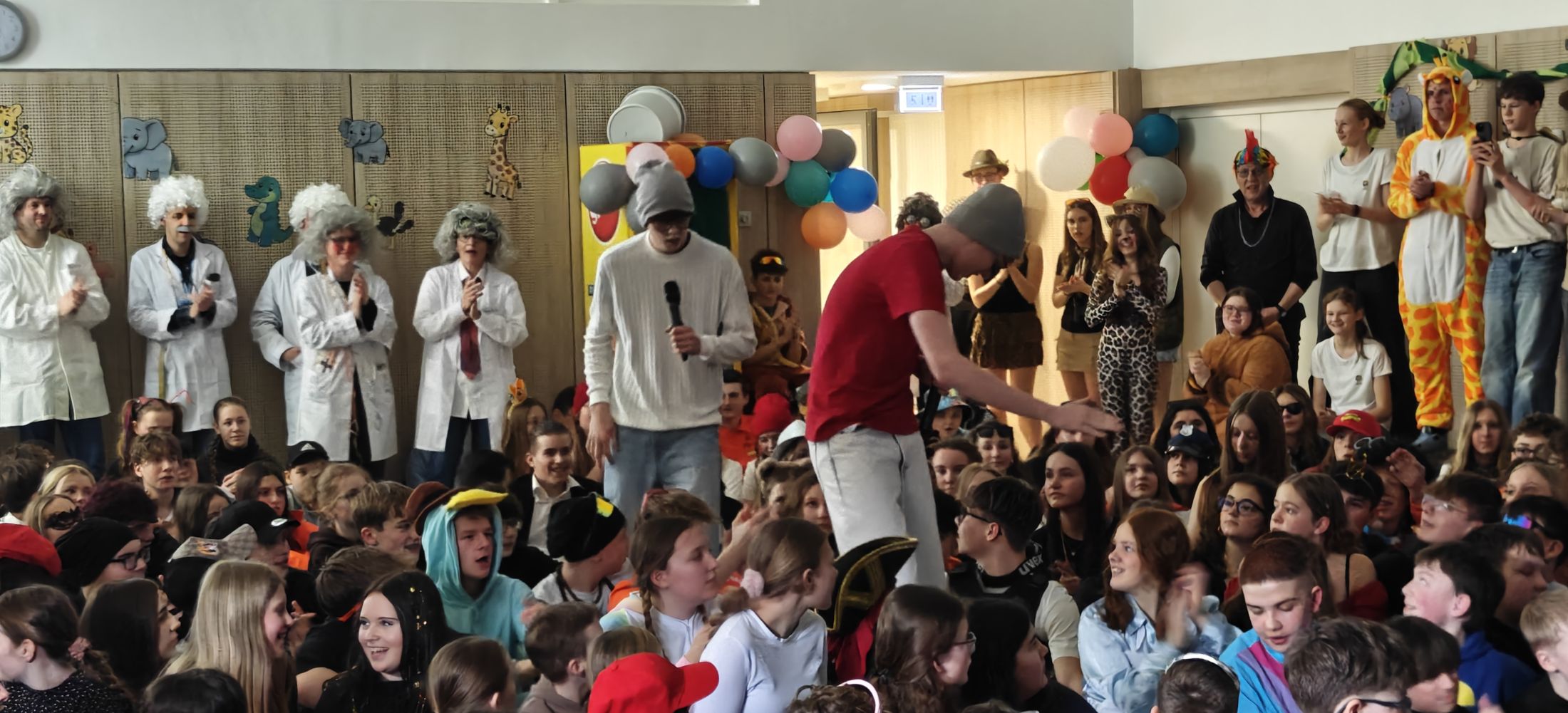 Auch unsere Lehrerinnen und Lehrer haben vollen Einsatz gezeigt! Viele von ihnen wurden in die unterschiedlichen Spiele integriert und sorgten mit ihrer humorvollen Teilnahme für viele Lacher und „funny moments“. Und als wäre das nicht schon genug, haben das Kollegium inkl. Herr Kayser auch noch ein witziges Video gedreht, um auf ihre ganz eigene Art zu verdeutlichen, „wie supergeil“ unsere Schule ist. Die Schüler waren begeistert und prämierten das Ergebnis mit langanhaltendem Applaus!