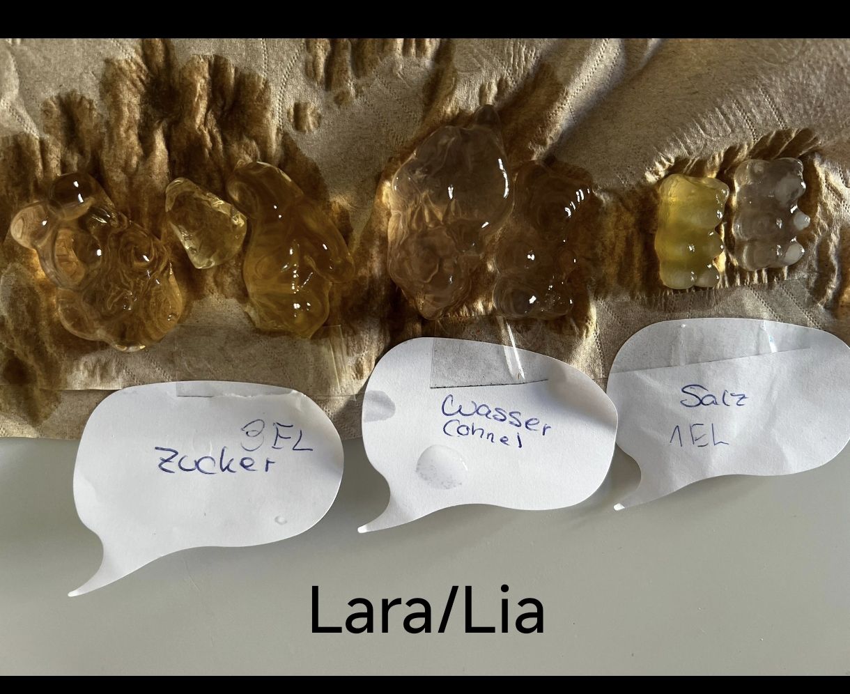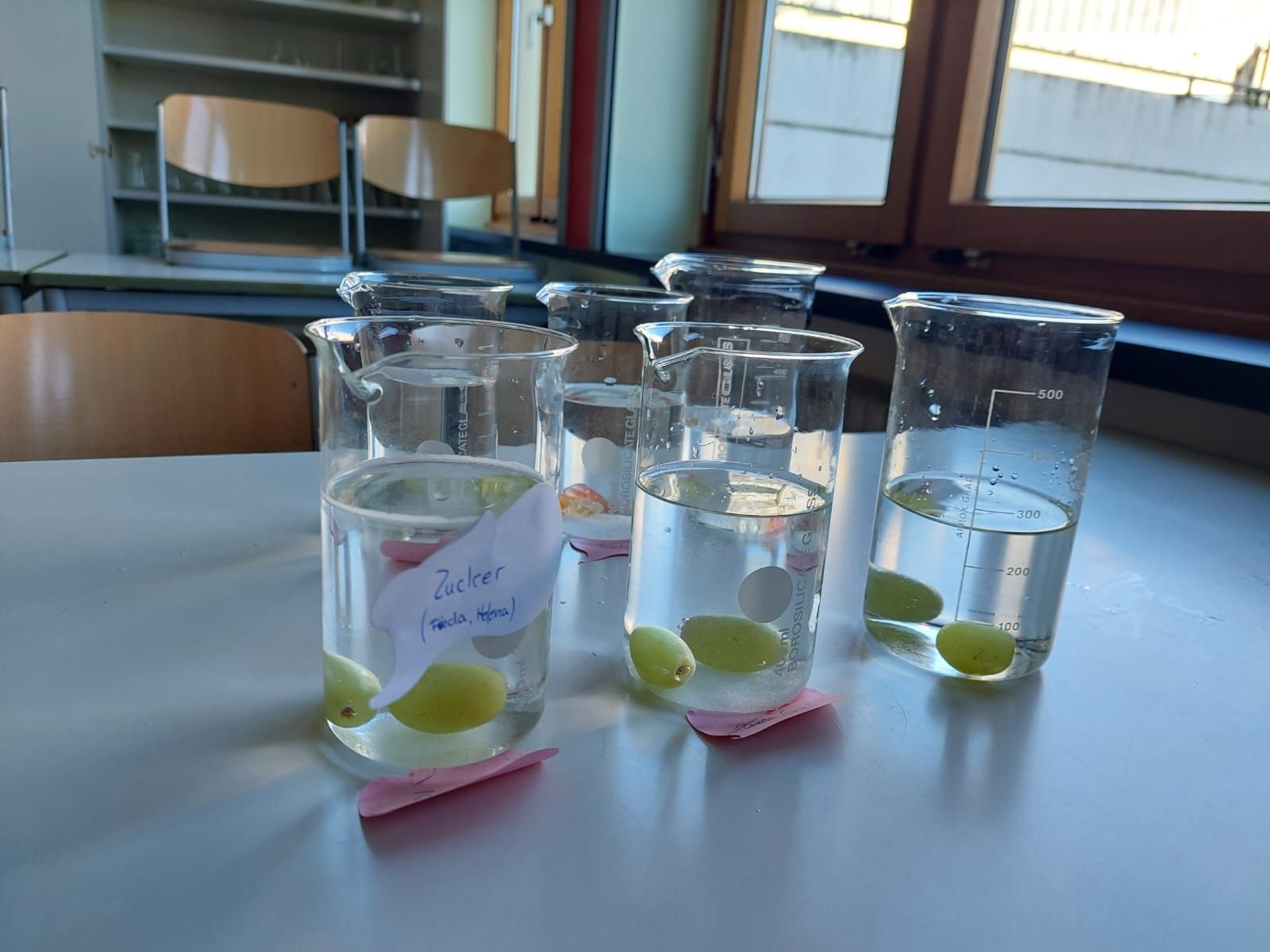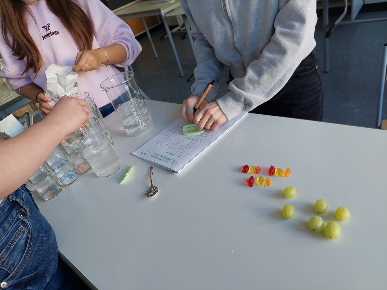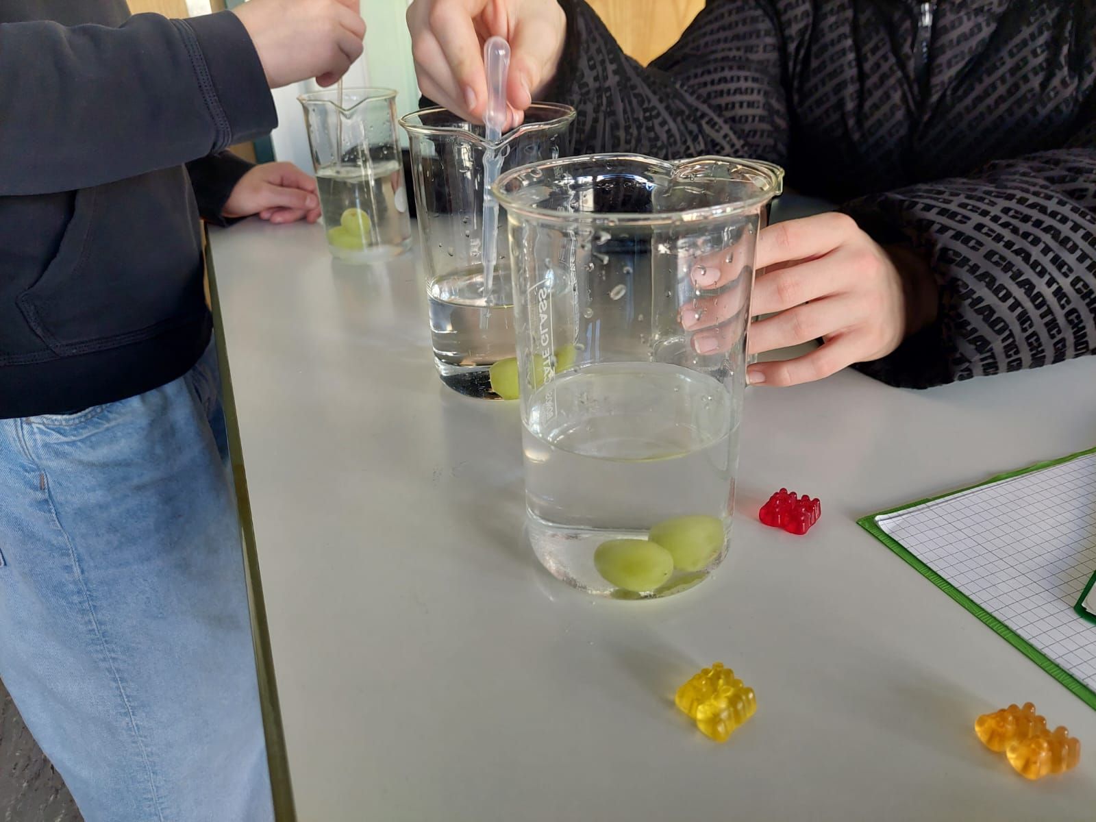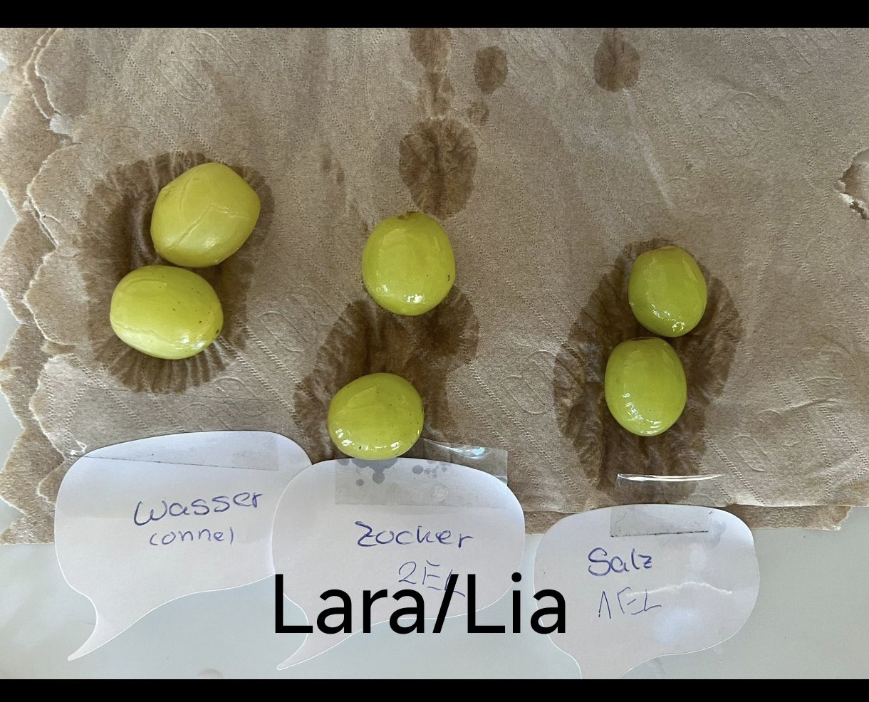 Danach ging es weiter mit dem Thema Osmose: Mithilfe eines Osmometers sowie Gummibärchen und Weintrauben in Salz-, Zucker- und Wasserlösungen beobachteten die Schülerinnen und Schüler hautnah, wie Flüssigkeiten durch Membranen wandern – und was das für lebende Zellen bedeutet. Der Kontrollansatz mit reinem Wasser half dabei, die Ergebnisse sauber zu vergleichen und einzuordnen.